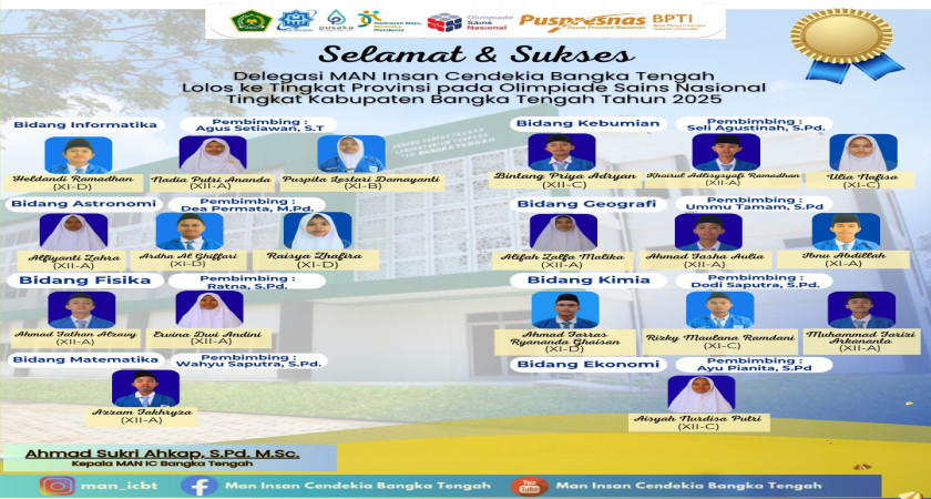 Bangka Tengah, 16 Juli 2025 — MAN Insan Cendekia Bangka Tengah kembali mencatatkan prestasi gemilang di ajang Olimpiade Sains Nasional (OSN). Sebanyak 19 siswa dari berbagai bidang keilmuan dinyatakan lolos ke OSN Tingkat Provinsi Tahun 2025, setelah melalui seleksi ketat di tingkat kabupaten.