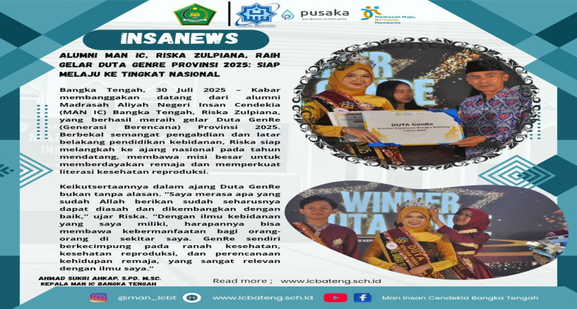 Bangka Tengah, 30 Juli 2025 – Kabar membanggakan datang dari alumni Madrasah Aliyah Negeri Insan Cendekia (MAN IC) Bangka Tengah, Riska Zulpiana, yang berhasil meraih gelar Duta GenRe (Generasi Berencana) Provinsi 2025. Berbekal semangat pengabdian dan latar belakang pendidikan kebidanan, Riska siap melangkah ke ajang nasional pada tahun mendatang, membawa misi besar untuk memberdayakan remaja dan memperkuat literasi kesehatan reproduksi.